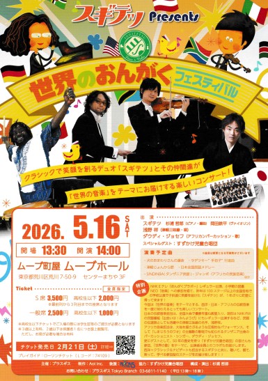 ★NEW★ すずかけ児童合唱団出演 「スギテツ presents 世界のおんがくフェスティバル」 日時:2026年5月16日(土) 14時開演 場所:ムーブ町屋 ムーブホール 〒116-0002 東京都荒川区荒川7-50-9 センターまちや3F 町屋駅徒歩1分 世界のおんがくフェスティバルのページ チケット: S 3,500円 高校生以下 2,000円 (全席自由・税込) 一般席 2,500円 高校生以下 1,000円 (全席自由・税込) お問合せ:プラスギス Tokyo Branch Tel/Fax:03-6811-1140(平日13-18時) ![]() |