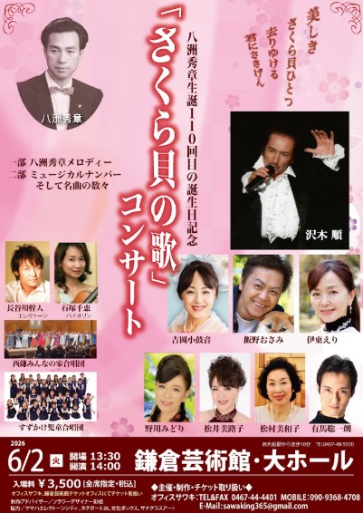 ★NEW★ 「さくら貝の歌」コンサート 日時:2026年6月2日(火) 場所:鎌倉芸術館・大ホール 時間 13時30分開場/14時開演 チケット:3,500円 (全席指定・税込) お問合せ:オフィスサワキ 0467-44-4401 鎌倉芸術館チケットセンター 0120-1192-40 (受付時間は10時から19時) 鎌倉芸術館のサイトです |