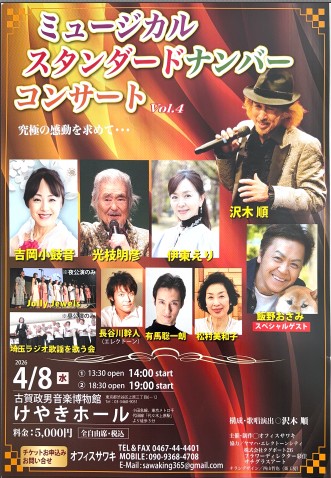 ★NEW★ 「ミュージカルスタンダードナンバーコンサート」 日時:2026年4月8日(水) 場所:古賀政男博物館 けやきホール 〒151-0064 東京都渋谷区上原三丁目6-12 代々木上原下車徒歩3分 古賀政男博物館のサイトです 時間:14時開演 / 19時開演 (2回公演) チケット:5,000円 (全席自由・税込) お問合せ・チケットお申し込み:オフィスサワキ Tel/Fax:0467-44-4401 mobile :090-9368-4708 email :sawaking365@gmail.com ![]() |